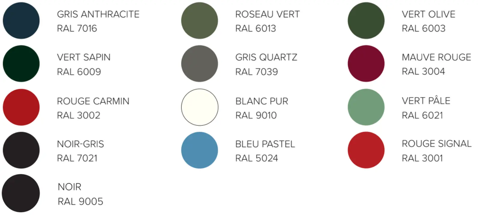 - La couleur par défaut est l’aluminium, mais en option vous pouvez appliquer un laquage. Les couleurs RAL standard sont les suivantes : Noir (RAL 9005), Gris anthracite (RAL 7016), Roseau vert (RAL 6013), Vert olive (RAL 6003), Vert sapin (RAL 6009), Gris quartz (RAL 7039), Mauve rouge (RAL 3004), Rouge carmin (RAL 3002), Blanc pur (RAL 9010), Vert pâle (RAL 6021), Noir-gris (RAL 7021), Bleu pastel (RAL 5024), Rouge signal (RAL 3001).