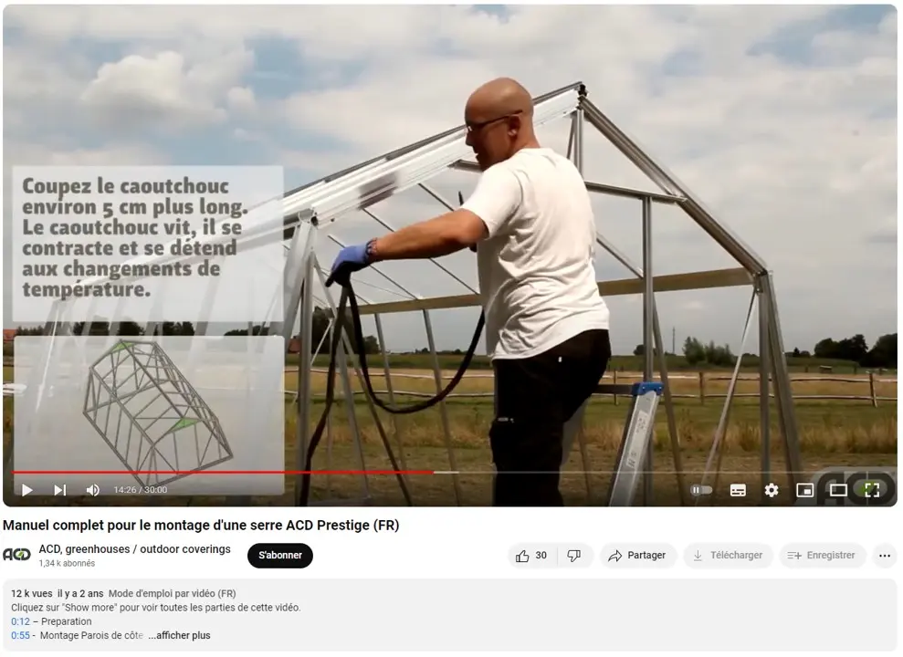 - Pour obtenir un service de montage, vous pouvez contacter un monteur certifié dans votre région. Pour monter la serre vous-même, il vous faut les outils suivants : mètre-ruban, visseuse-perceuse, forêt métal 3 mm, ventouse pour porter du verre, cutter, tournevis, clé de 10, pince, pince coupante, maillet, niveau d’eau, pelle