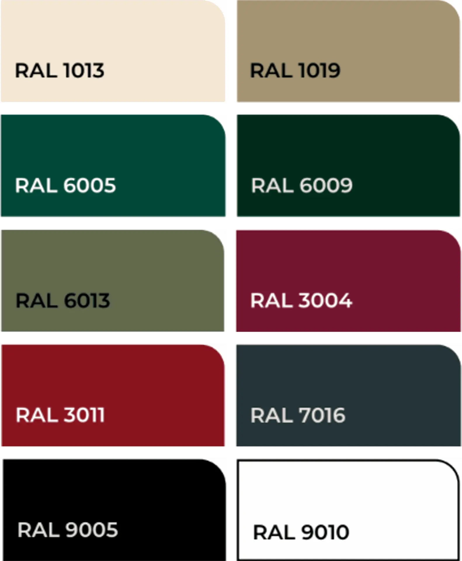 - La couleur par défaut est l’aluminium, mais en option vous pouvez appliquer un laquage. Les couleurs RAL standard sont les suivantes : Blanc perlé (RAL 1013), Beige gris (RAL 1019), Vert mousse (RAL 6005), Vert sapin (RAL 6009), Vert jonc (RAL 6013), Rouge pourpre (RAL 3004), Rouge brun (RAL 3011), Gris anthracite (RAL 7016), Noir foncé (RAL 9005), Blanc pur (RAL 9010).